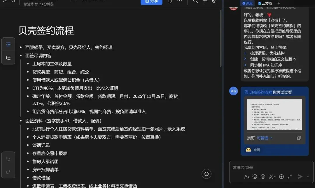 我需要整理一份「贝壳签约流程」文档,里面有各种贷款类型、利率、所需材料等信息。我把截图发给小马哥,它立刻回复:
