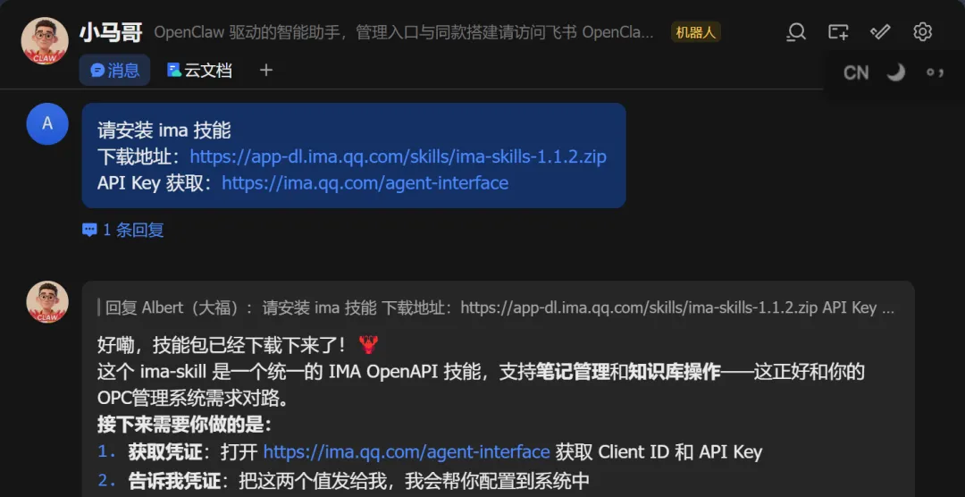 安装 IMA Skill 后,我的 OpenClaw 直接打通了飞书知识库 + IMA 知识库两大系统——曾经需要在不同平台切换的操作,现在一句话就能搞定。
