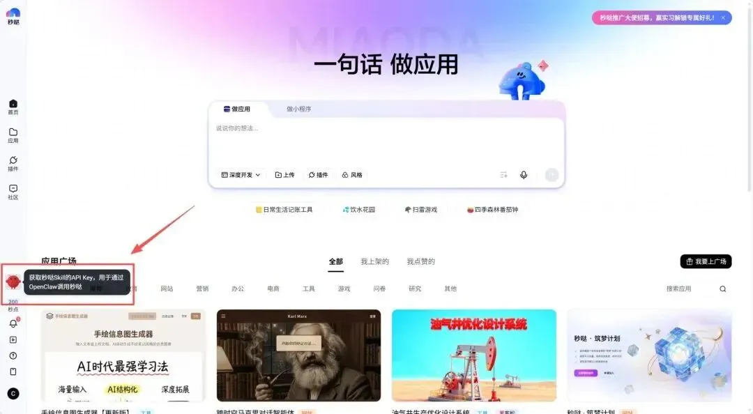 🔗 直达链接:https://www.miaoda.cn/?invitecode=user-8wb9yfd2pfcw✅核心功能百度将 OpenClaw 内置为秒达 Skill,无需手动对接接口,自然语言即可完成应用创建、修改、发布全流程。相当于专属 AI 开发助手,10 秒生成并自动上线小程序,告别半天折腾,独立开发者、小团队效率神器。✨核心优势✔ 深度打通百度无代码生态,AI 开发 + 一键上线一站式搞定;✔ 支持批量应用开发,重复需求自动生成;✔ 文心大模型赋能,代码质量高、bug 少;✔ 新用户赠免费额度,小项目零成本。👥适合人群:独立开发者、小微企业、AI 应用入门者3️⃣ 扣子 Coze(字节跳动)