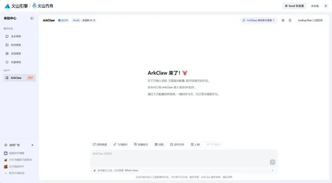🔗 直达链接:https://ai-to.cn/url?u=coze🔗 部署文档:https://docs.coze.cn/tutorial/openclaw✅核心功能字节官方 AI Agent 平台,堪称字节版 “GPTs”,零代码创建 AI 助手,支持一键部署 OpenClaw + 飞书集成,自动操控办公流程。最大亮点:深度打通飞书、微信等国内办公平台,AI 助手可处理日程、整理消息、自动回复,执行复杂多步骤任务。✨核心优势✔ 字节官方出品,技术靠谱、品牌保障;✔ 一键部署 OpenClaw,官方文档详细,小白易上手;✔ 办公平台深度适配,多场景协同无压力;✔ 海量 AI 助手模板,直接复用不从零开始。👥适合人群:多平台办公用户、AI 助手快速创建者、飞书 / 微信办公党4️⃣ ArkClaw(火山引擎・字节跳动)