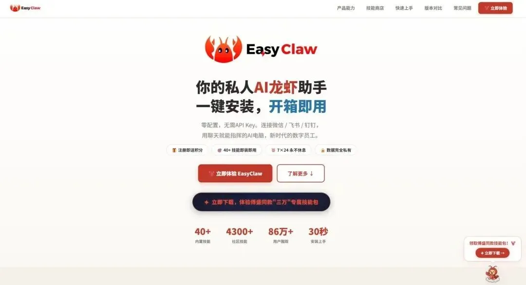 🔗 直达链接:https://easyclaw.ijinshan.com/🔗 官方站点:https://easyclaw.com/zh-cn/✅核心功能零配置本地 OpenClaw 客户端,小白一键养 “龙虾”!彻底解决原版部署难题,双击安装即用,无需配环境、装 Python、填 API Key,3 分钟上手。支持微信 / 飞书 / 钉钉远程操控,处理文件、写代码、下资料、整文档,内置 40 + 现成技能,7×24 小时响应。本地运行,数据存本地,隐私安全,注册送免费积分。✨核心优势✔ 真正零配置,无技术门槛;✔ 多平台远程操控,随时随地响应;✔ 本地运行,隐私百分百可控;✔ 免费积分够用,个人使用零成本。🔟 360 SafetyClaw