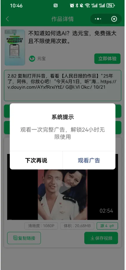粘贴链接 → 看 30 秒广告 →保存到手机✅ 优点:不用电脑、不用抓包、一键保存