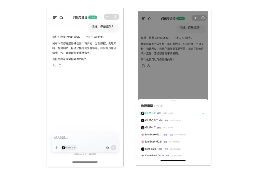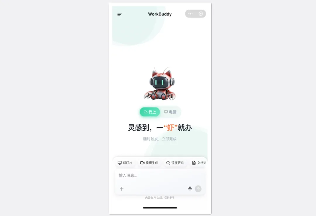 可以看到小程序版本的WorkBuddy分为云上和本地电脑两种模式,云上就是直接是远程的服务器,OpenClaw已经都装好配置好了,只需要给它发指令即可。