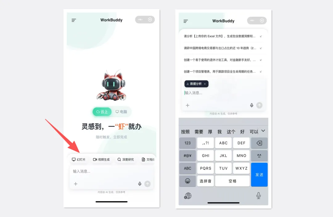 本地电脑这种模式,就是和本地电脑上安装的WorkBuddy进行了打通,让我们可以在WorkBuddy小程序中直接给本地电脑的WorkBuddy下发任务。