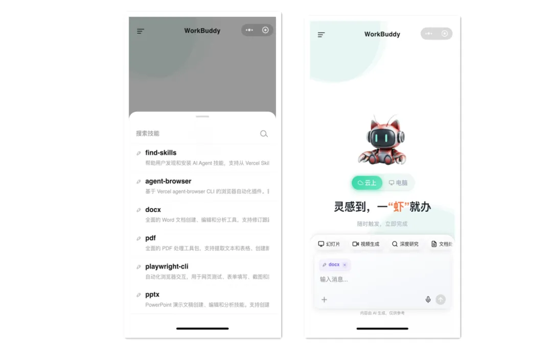 在技能方面,小程序版的WorkBuddy,支持直接在聊天框中选择对应的skills,然后使用它,比如我选择了一个文档处理的skills,再输入我的需求即可。