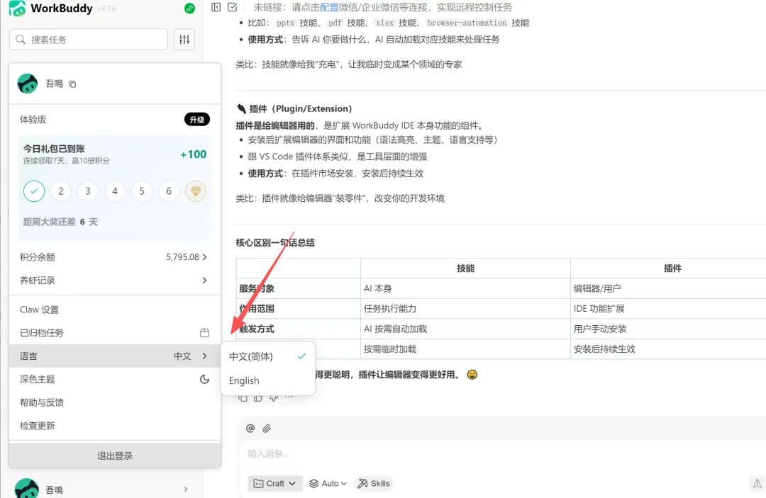 可能刚刚安装完WorkBuddy之后,默认会是英文版本的WorkBuddy,可以点击左下角的登录头像选择中文,便可以切换成中文版了。