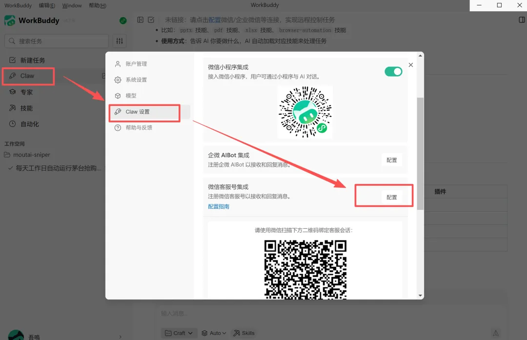 完成登录之后,便到左侧菜单栏的“Claw”菜单,点开后找到Claw设置,找到“微信客服号集成”,点击配置,会打开一个二维码,打开微信扫码,便可以实现与微信进行打通了。