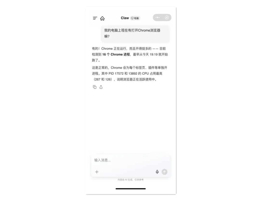 当与微信客服号集成后,便可以在微信小程序端来操控桌面端的WorkBuddy了,像我就直接给我电脑上的WorkBuddy帮我检查一下我的Chrome浏览器是不是还打开的。