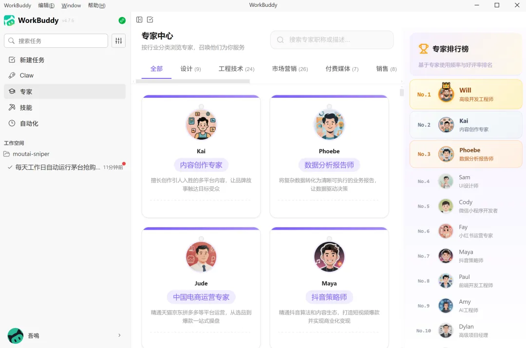 WorkBuddy这次桌面版的升级,也有一个让人眼前一亮的东西,那便是它的专家中心,里面有非常多现成的专家智能体,直接开箱即用。