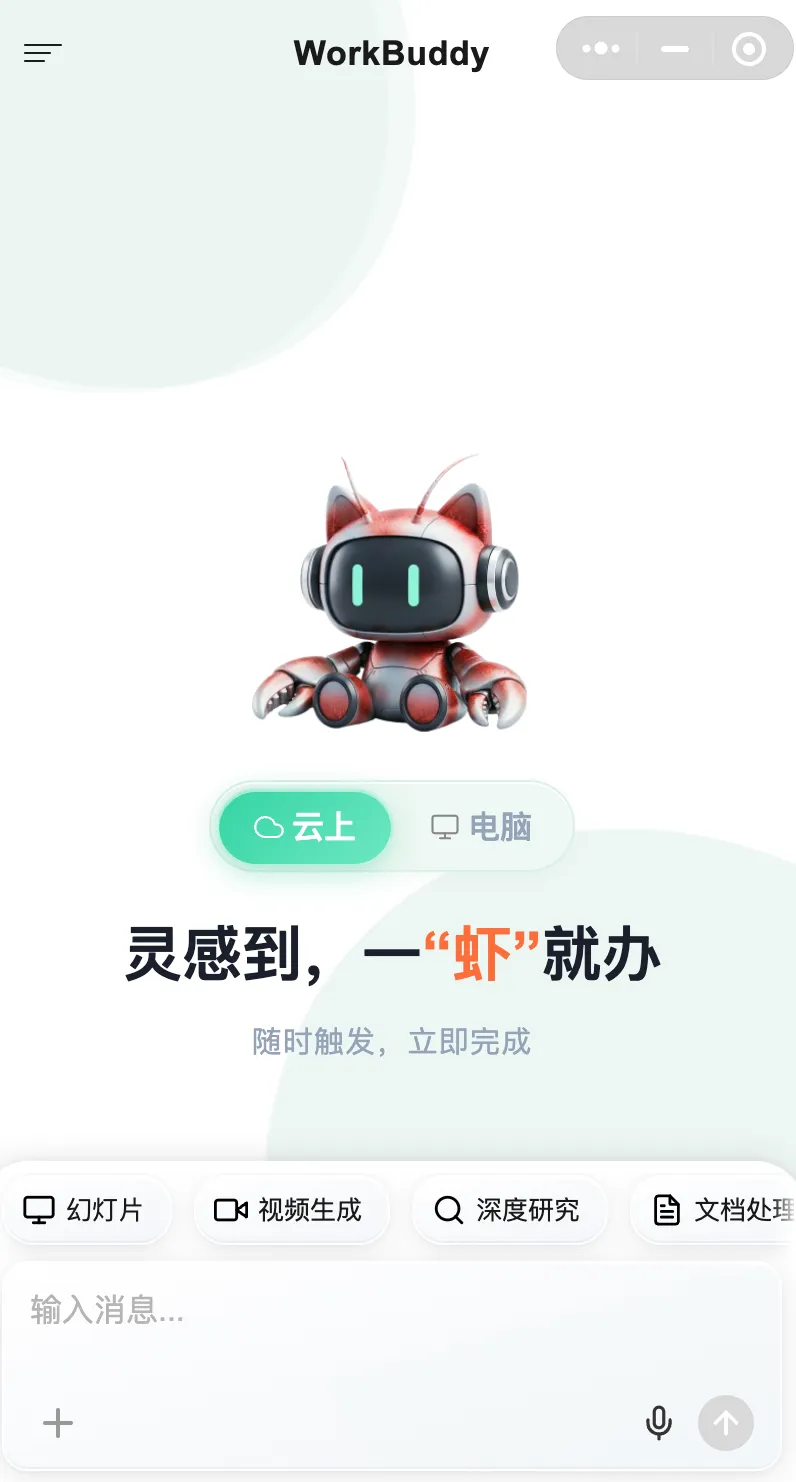 - 部分功能依赖电脑端技能包:如果你电脑端的 WorkBuddy 安装了很多技能包,小程序云上模式用不了。得在云端重新配。