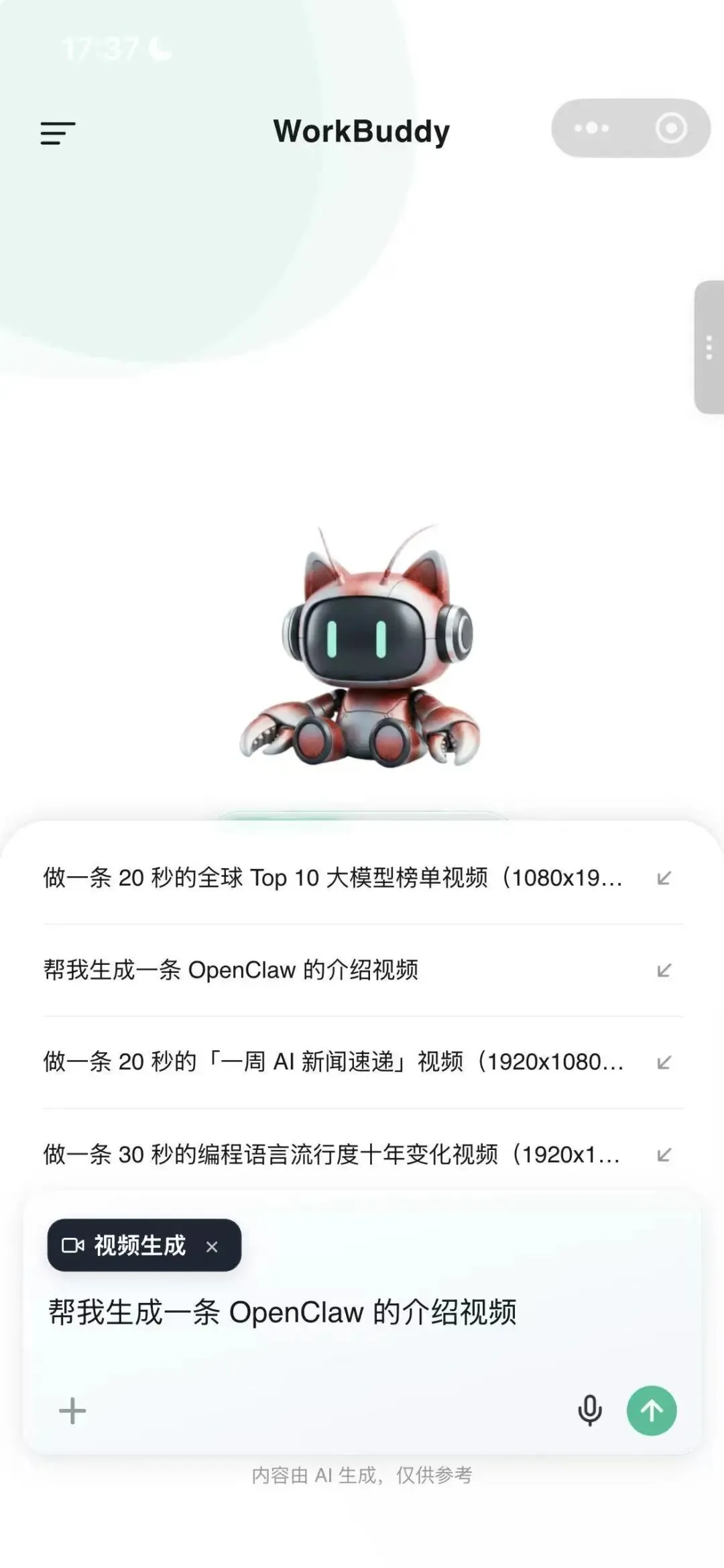 操作也非常简单,登录关联微信就可以直接使用了,记得电脑端口也安装一个哈,快速拉通。我这边还在排队点餐,手机里打开小程序,语音说了句「帮我查一下下周的会议安排,整理成清单发给我」。在外面,要生成一个介绍Open Claw的介绍视频。打开小程序,输入需求。其实,核心的差异在于,小程序让 WorkBuddy 变成了「随时能用」的工具,而不是「得回到电脑前才能用」。- 语音派活:不用打字,直接说话。开车、走路、排队的时候都能用。