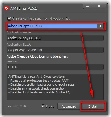 温馨提示:若打开没有破解工具,说明被电脑杀毒软件隔离了,关闭杀毒软件重新解压即可。 9.第一个选项卡选择Adobe InCopy CC 2017,点击“Install”