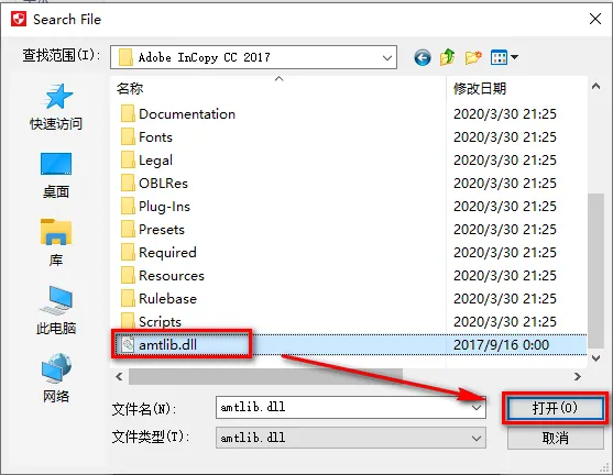10.在弹出的文件资源管理器中,找到软件安装目录下的amtlib文件,点击“打开”。 默认路径为:C:\Program Files\Adobe\Adobe InCopy CC 2017