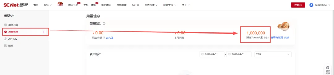 新用户登录后,系统会自动弹出“领取成功”的提示框,告诉你免费额度已经到账。 进入右上角的“控制台”。 在左侧菜单栏点击“用量信息”。在这里你可以清楚地看到当前账户的“赠送Token余量”,以及不同模型剩余的具体额度和有效期。