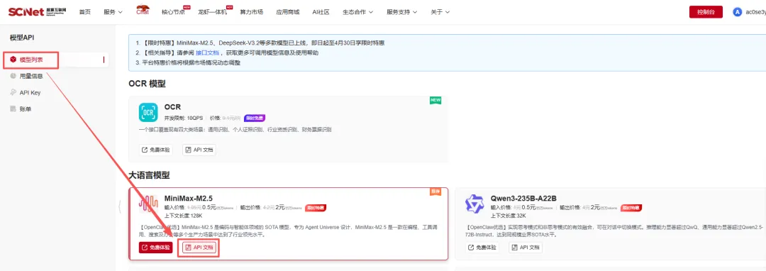 2.找到你想使用的模型(以 MiniMax-M2.5为例),点击“API 文档”查看详细的接入说明。
