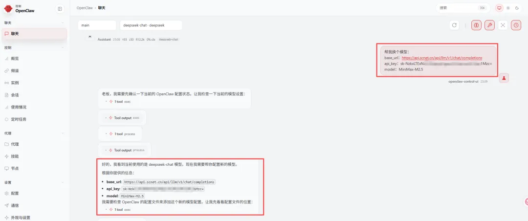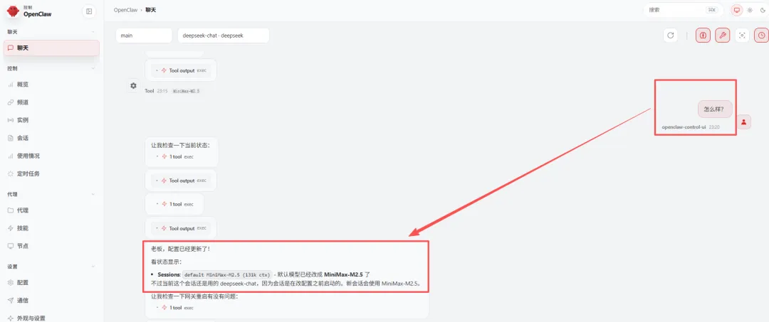 助手收到指令后会自动配置并重启Gateway。配置完成后,你可以向助手发送“你现在用的是哪个大模型?”进行确认。如果助手回复“已切换默认模型为MiniMax-M2.5,说明接入大功告成,可以直接开始对话了。