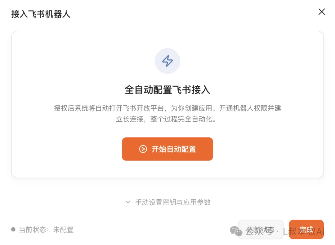 当你点击全自动部署之后,会弹出一个浏览器窗口,你只需要飞书扫码,机器人会全程帮你自动部署,过程超级解压.