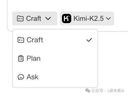 对话框里分为三种模式选项,分别是Craft,Plan,Ask