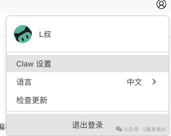 而你可以直接选择右上角「个人中心」然后选择「Claw设置」