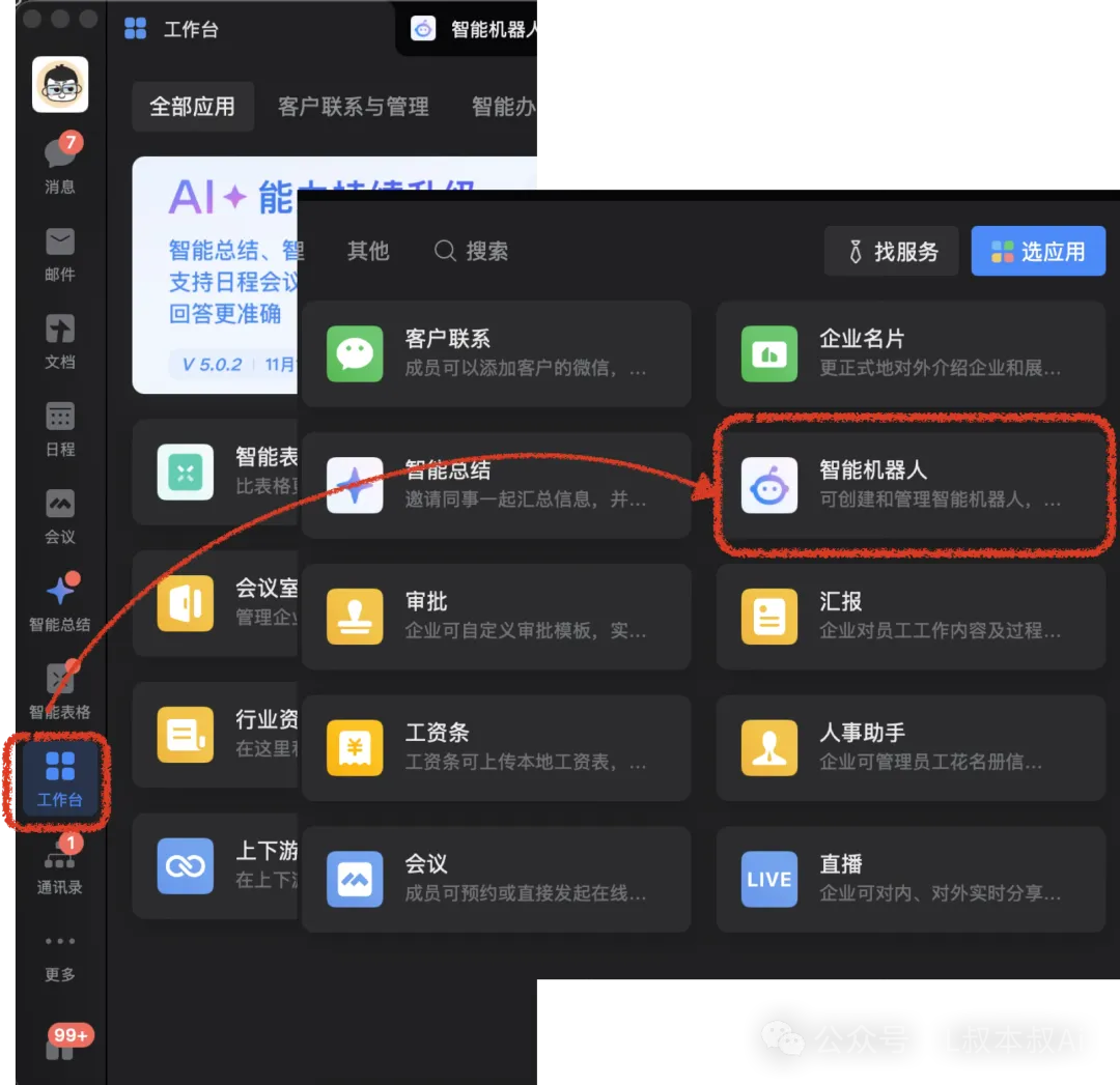 首先,你只需要下载安装企业微信之后,打开「工作台」选择「创建智能机器人」