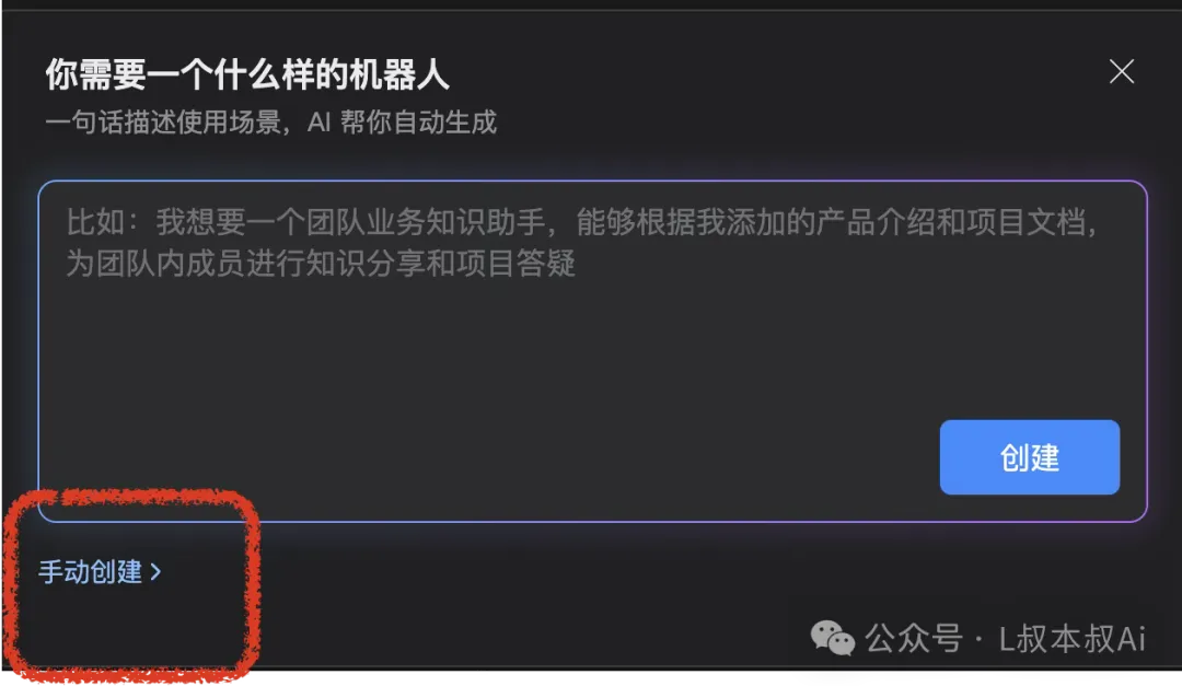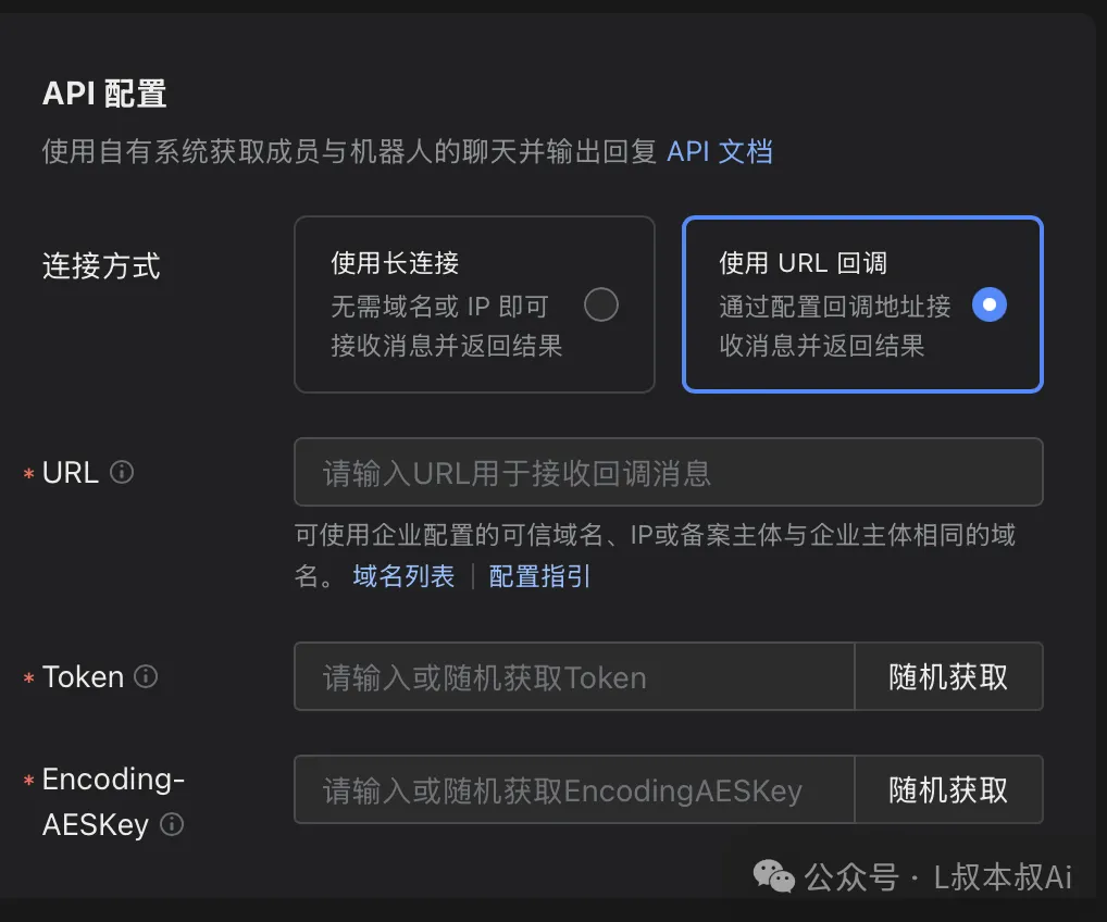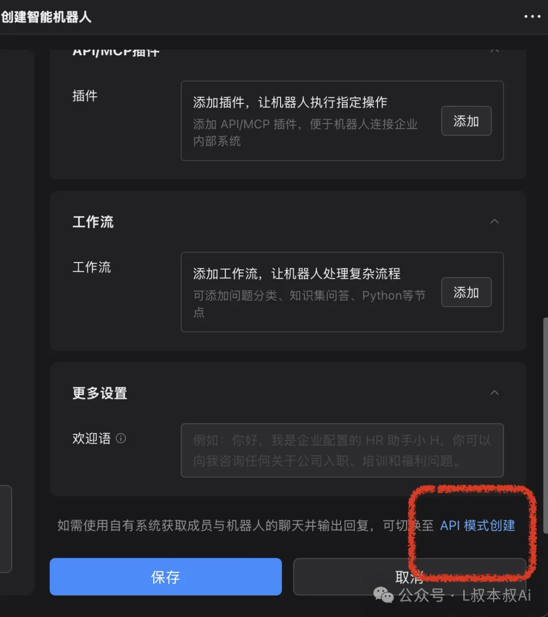 接着在创建机器人的页面里,拖到最底部,点击“以 API 模式创建”