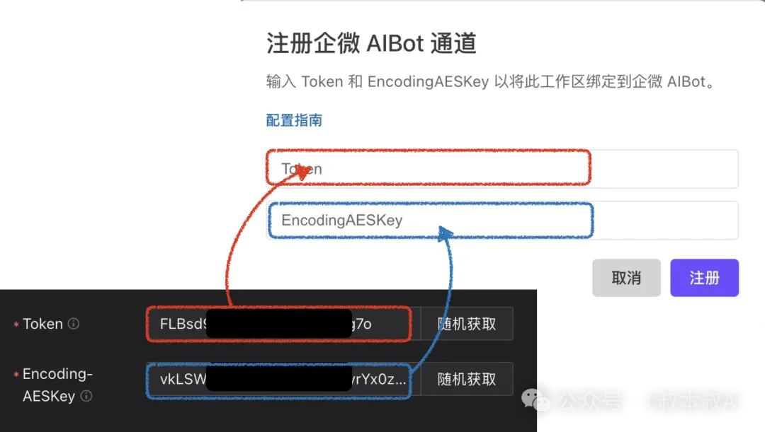 然后这个时候,你要回到 WorkBuddy,点击「企业微信」「配置」,把刚刚的 Token 和 Key 复制粘贴上去