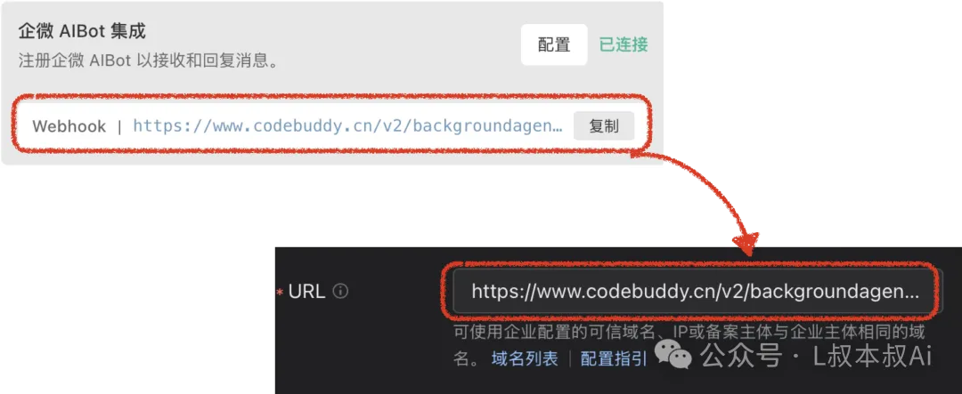 最后点击「注册」然后会生成一个webhook 链接地址,把这个地址复制粘贴到企业微信的URL中