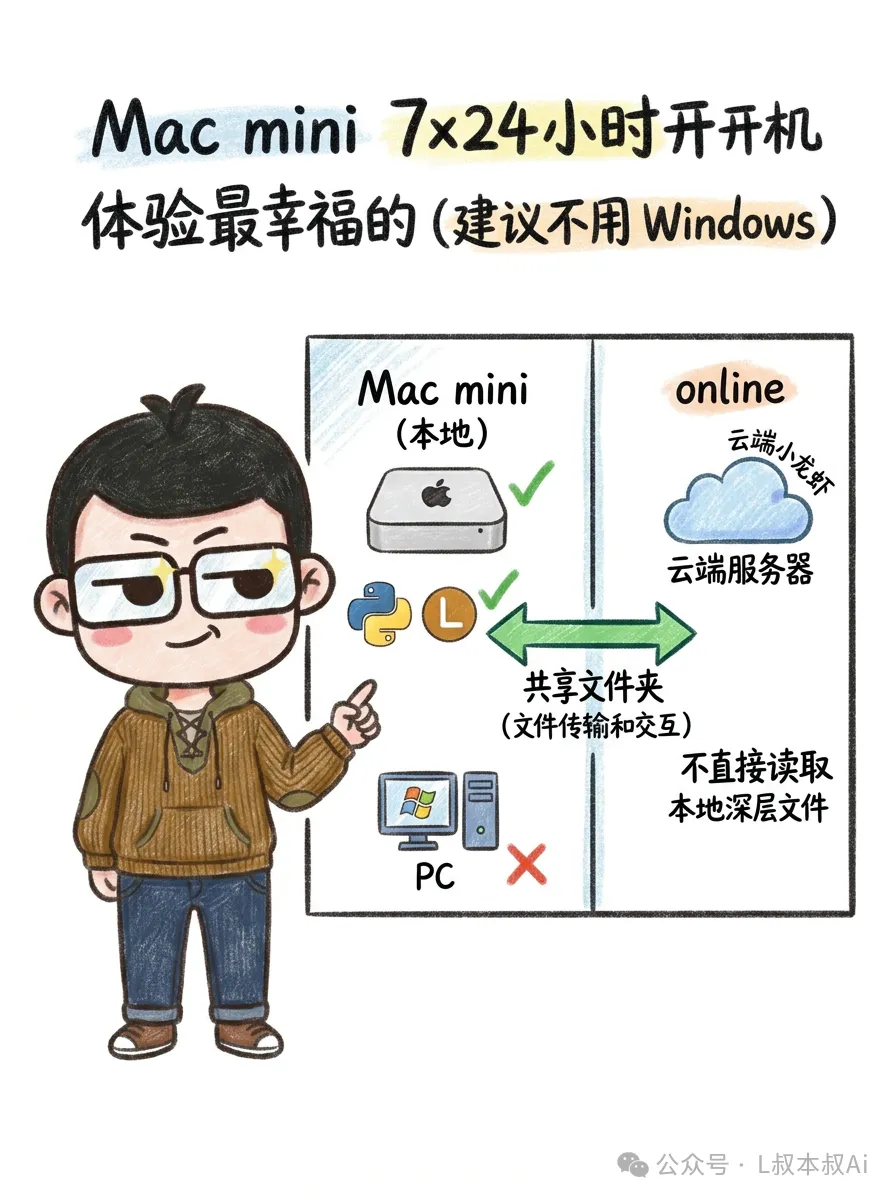 经过同时管理30多只小龙虾的测试,我认为目前的最佳架构方案是:云端部署 + 本地同步文件夹。