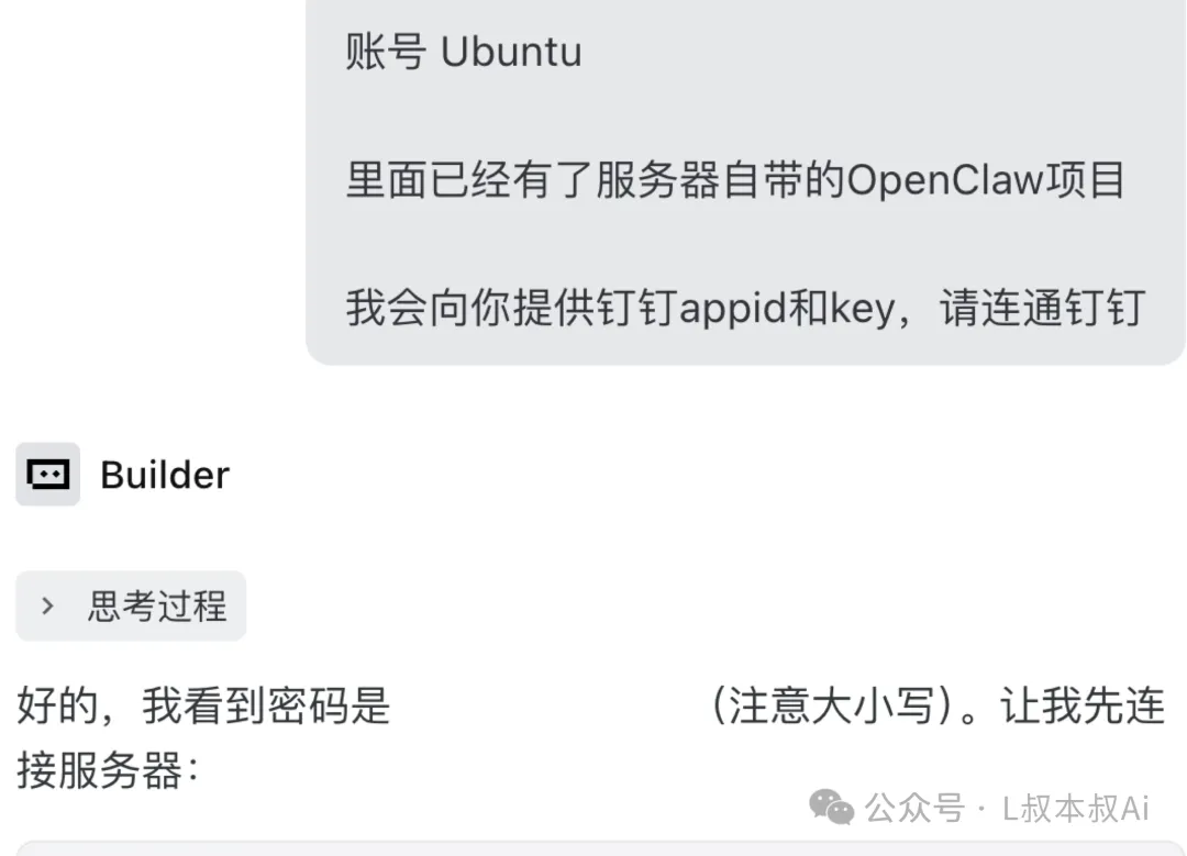 然后把这个服务器的IPV4地址和密码一起发过去给Trae,并且要求他连通钉钉作为和OpenClaw主要沟通的软件。