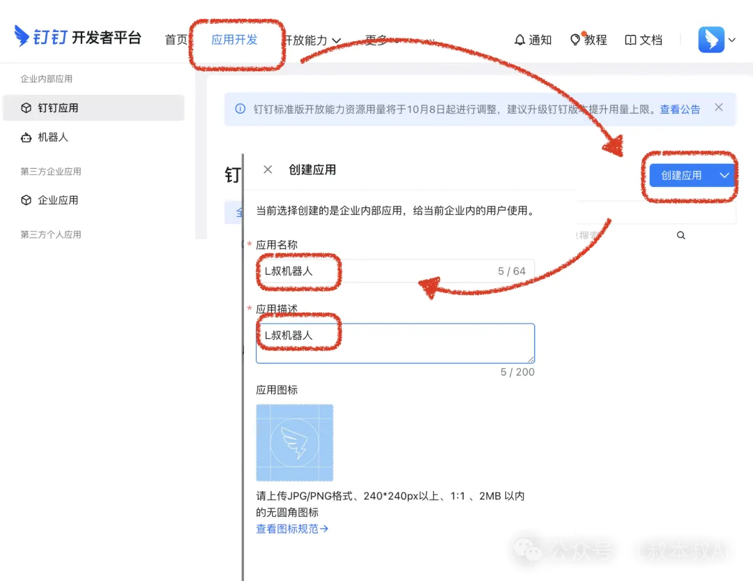 你只需要打开钉钉开发者后台,然后点击「应用开发」选择「创建应用」然后设定一个名字和描述 点击保存