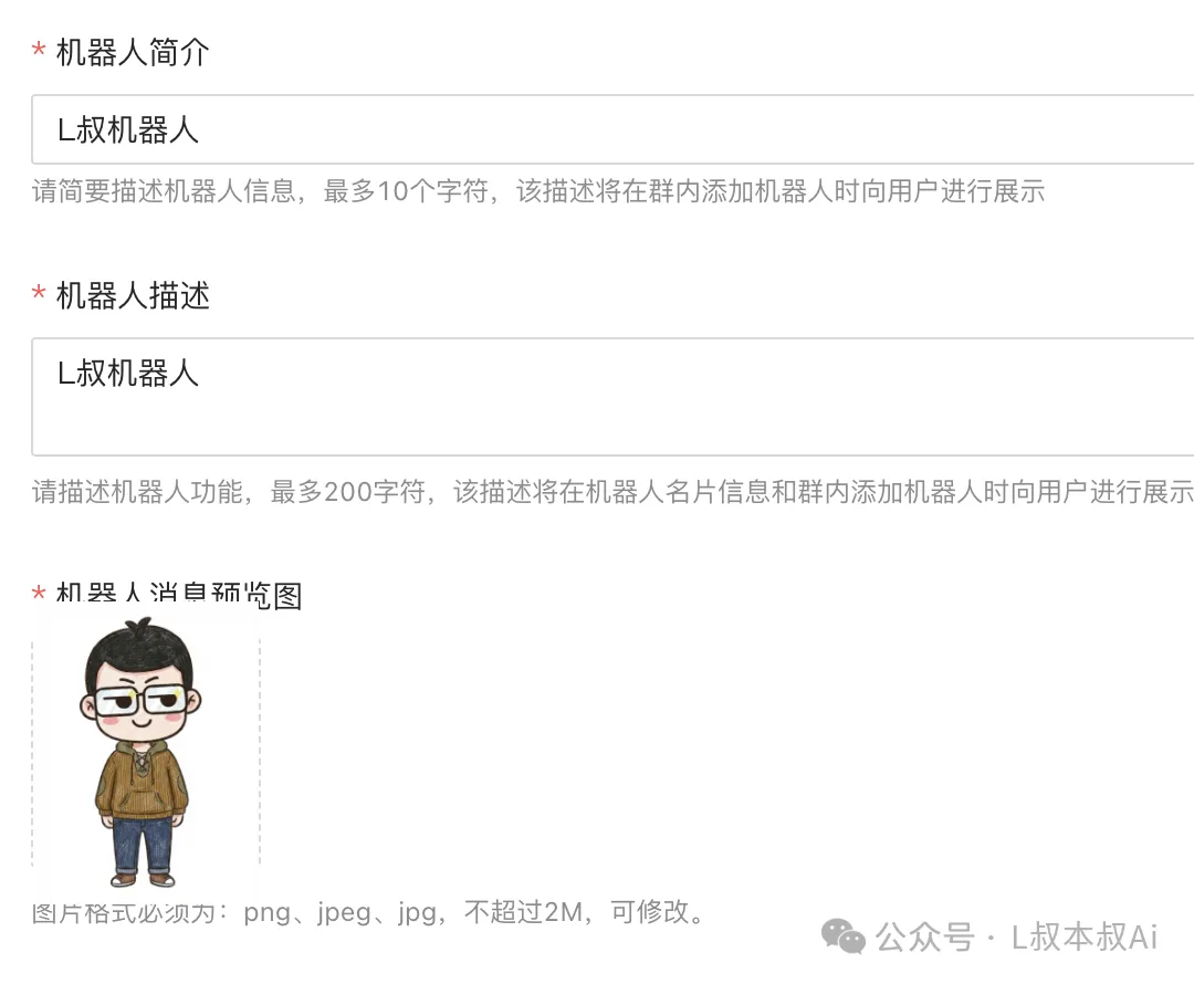 接着点击机器人配置,填完机器人简介,描述和上传一张消息预览图