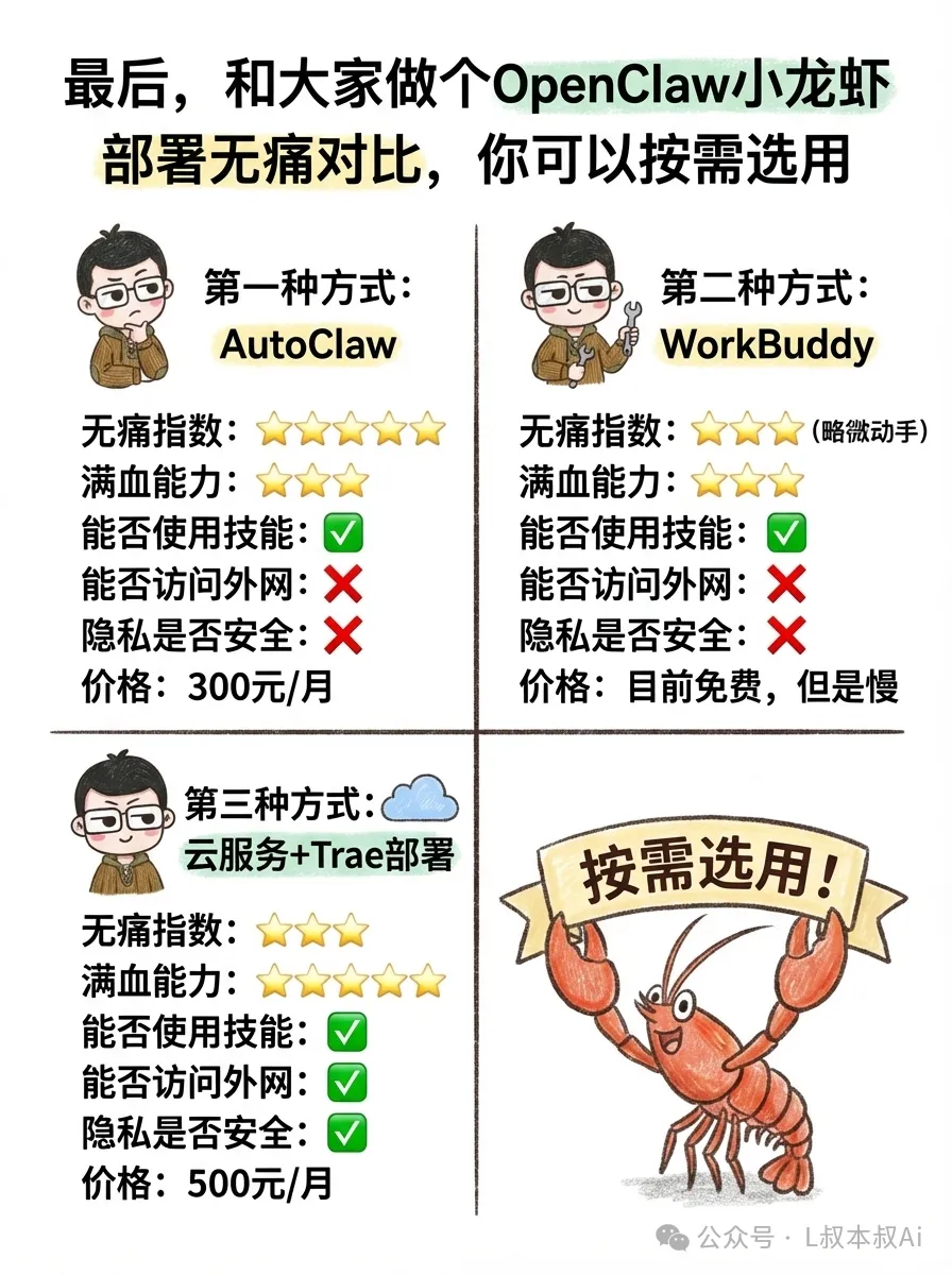 最后,和大家做个OpenClaw小龙虾部署无痛对比,你可以按需选用