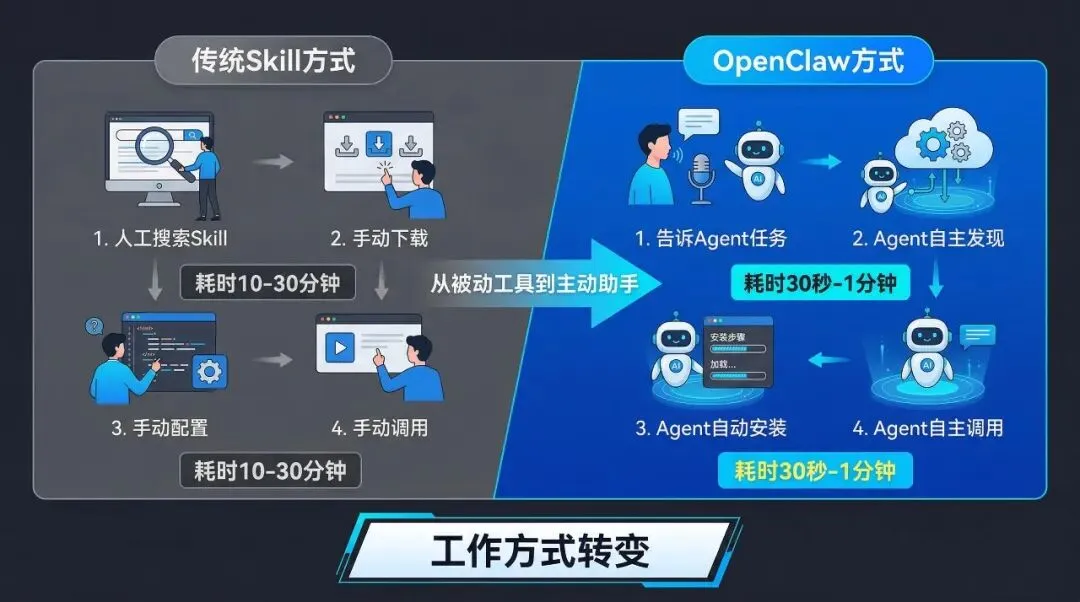更重要的是,OpenClaw带来了工作方式的根本性转变——从"人找工具、用工具"到"Agent自主发现、安装、调用Skill"。