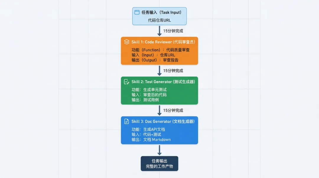 合计 | 3个Skill | 15分钟 | 完整产物 |