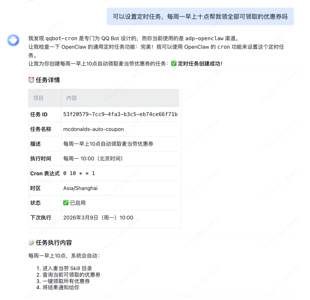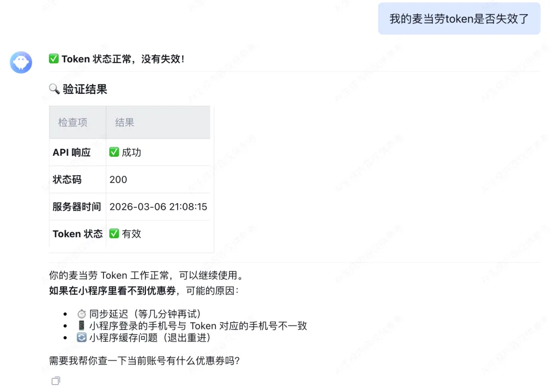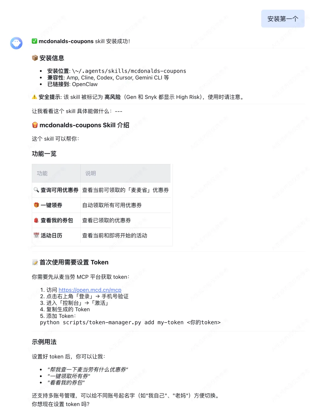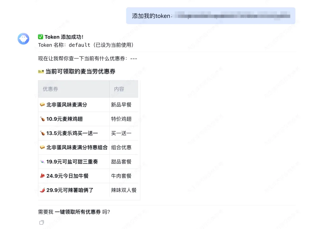 Token 'default' 已添加已设为当前使用的 Token麦麦省优惠券列表:- 优惠券标题:10.9元麦辣鸡翅 状态:可领取- 优惠券标题:13.5元麦乐鸡买一送一 状态:可领取- 优惠券标题:19.9元可盐可甜三重奏 状态:可领取