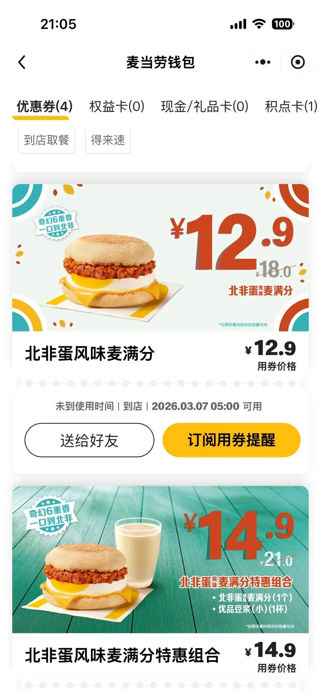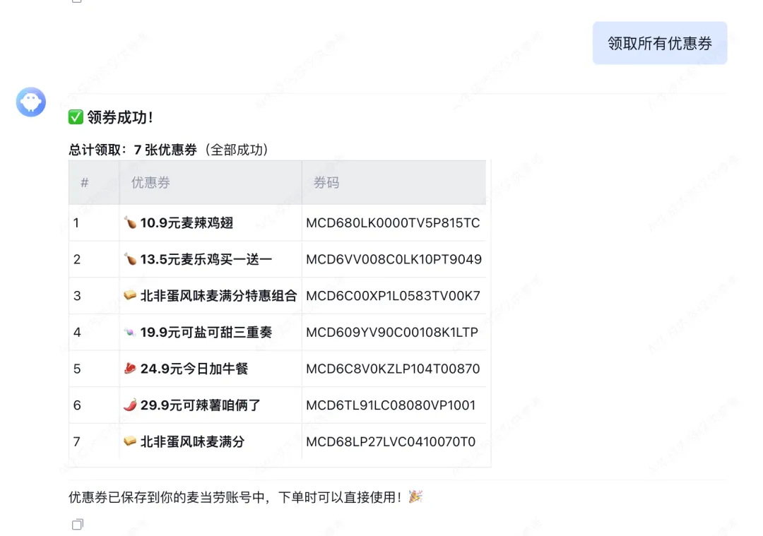 领券结果总计: 7 张优惠券成功: 7 张失败: 0 张#成功领取的优惠券:- 10.9元麦辣鸡翅 couponCode:MCD680LK0000TV5P815TC- 13.5元麦乐鸡买一送一 couponCode:MCD6VV008C0LK10PT9049...打开微信小程序