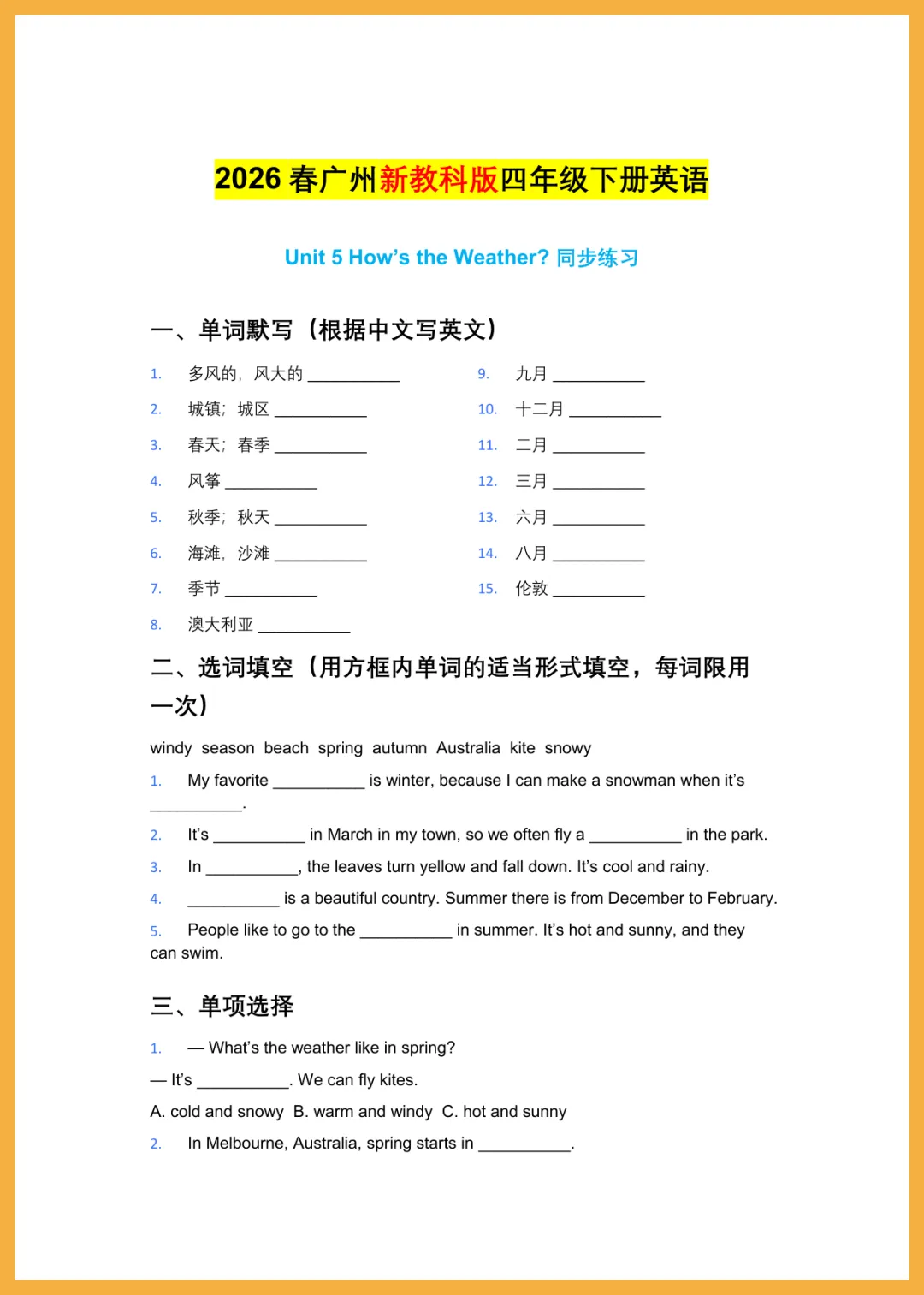 2024 年教科版四年级下册英语 Unit 5《How's the Weather》同步练习,共 4 页高清电子版。这份资料紧扣教材重点,涵盖天气词汇辨析、句型转换及情景对话等核心题型,题量适中且针对性强。通过专项训练,能帮助孩子熟练掌握描述天气的表达方式,夯实基础并提升应试能力,轻松应对单元检测。家长朋友们,赶紧下载打印出来,让孩子趁热打铁练一练吧!