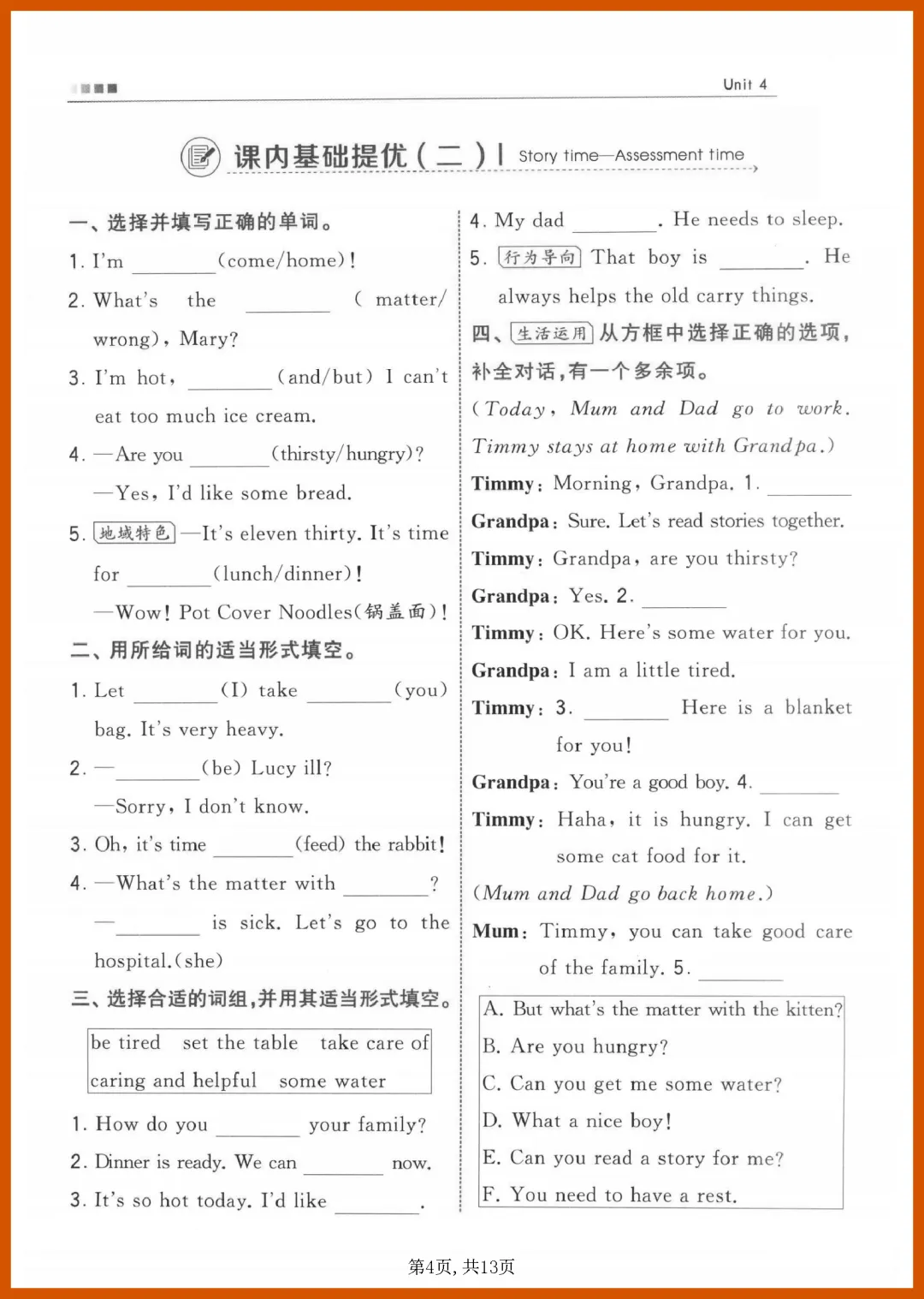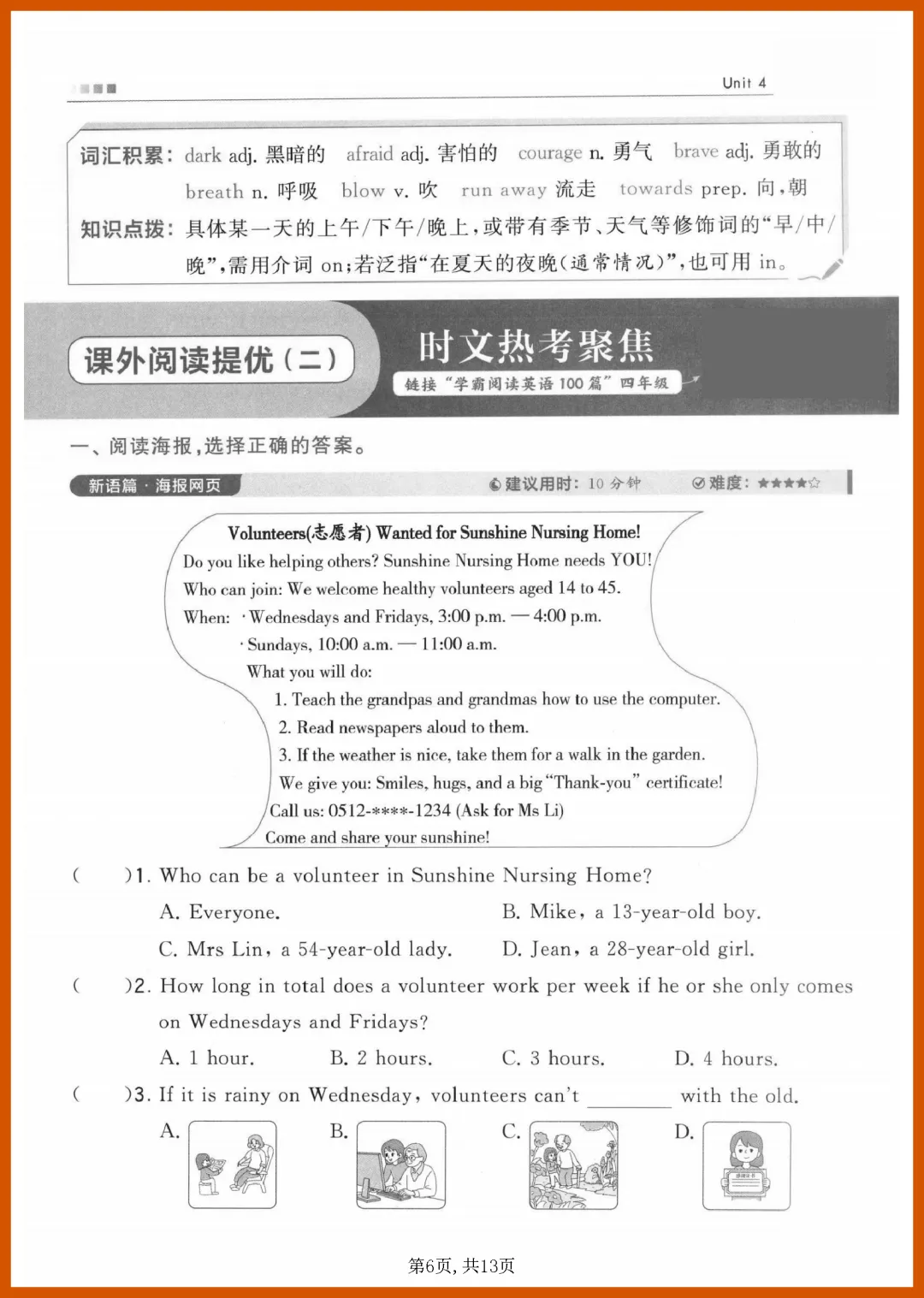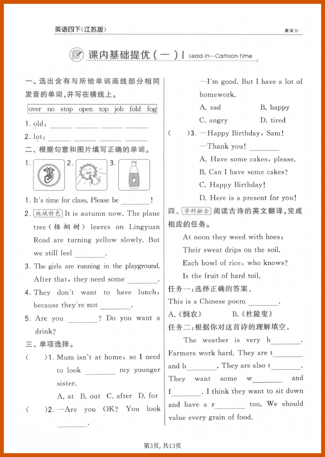 各位家长好!今天分享一份 2024 年译林版四年级下册英语第四单元综合练习,共 11 页精编内容。这份资料紧扣教材重点,涵盖词汇辨析、句型转换及阅读理解,能帮助孩子全面梳理单元知识,查漏补缺,轻松攻克学习难点。通过针对性训练,孩子不仅能巩固基础,还能提升解题自信。资源已整理完毕,需要的家长抓紧打印给孩子练一练吧,让孩子在练习中稳步进步!