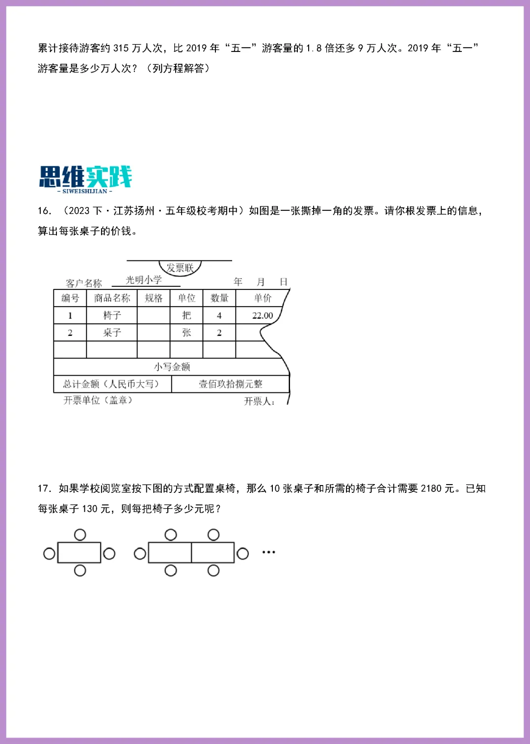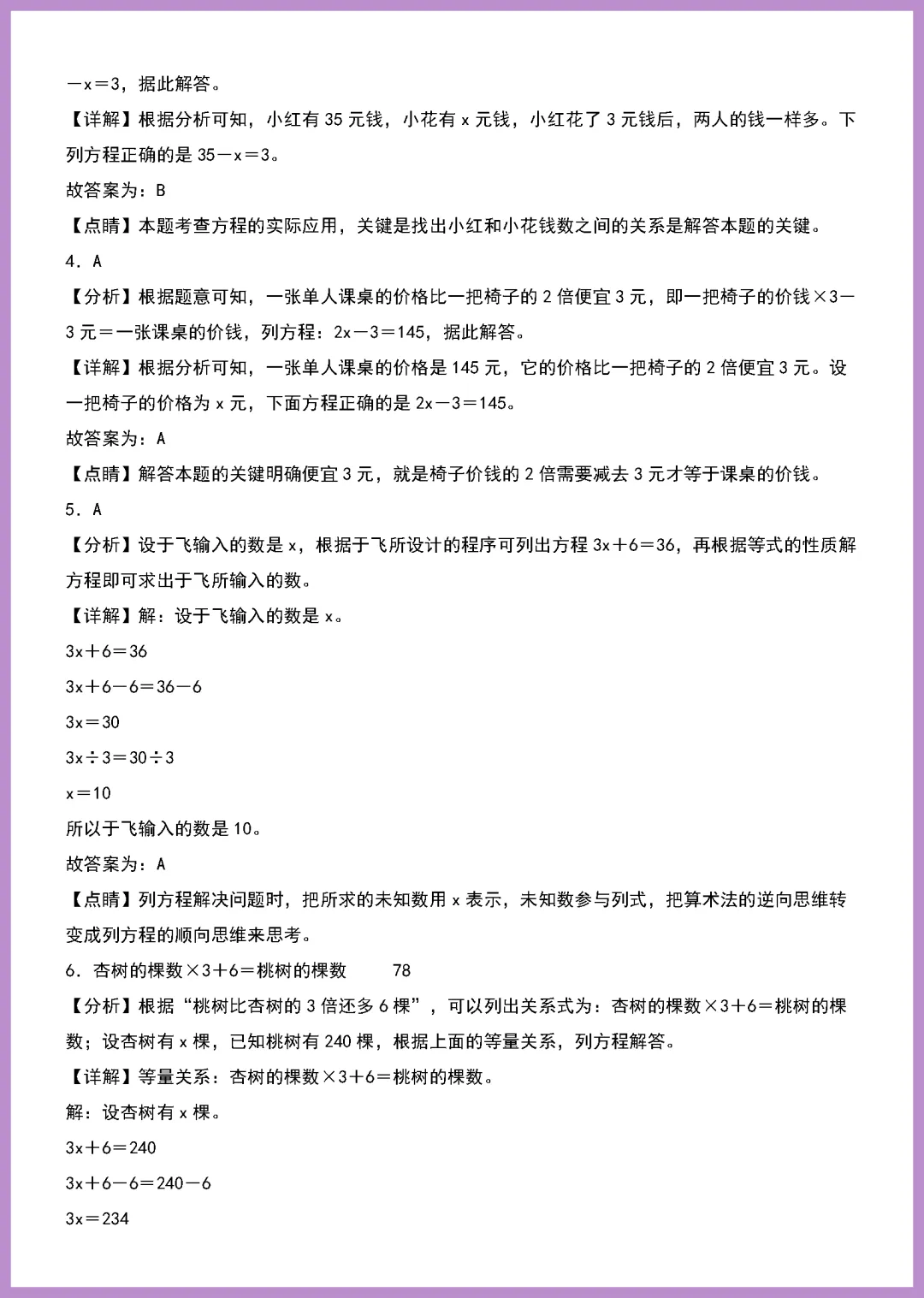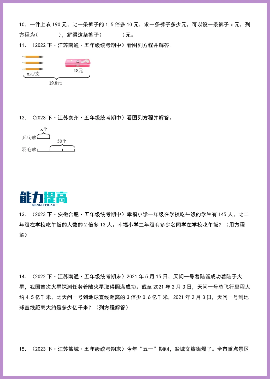 各位家长好!今天分享一份 2024 年苏教版五年级下册数学《列方程解决实际问题(一)》分层作业,共 9 页精编内容。资料紧扣课本难点,科学划分基础巩固与拓展提升板块,帮助孩子循序渐进掌握解题思路,轻松攻克应用题难关。通过针对性练习,能有效查漏补缺,提升孩子逻辑思维与应试能力。资源难得,需要的家长抓紧打印给孩子练一练吧,让孩子在练习中建立自信,数学成绩更上一层楼!