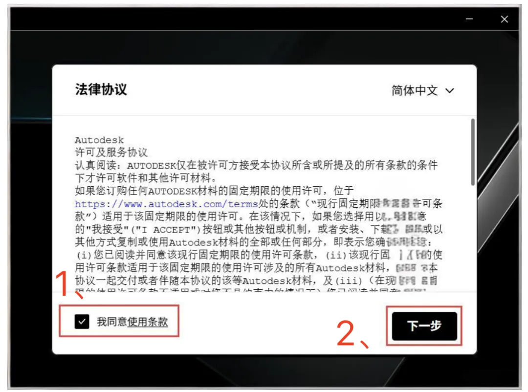 4、同意许可协议: 在安装界面中,勾选:我同意使用条款,然后点击:下一步。