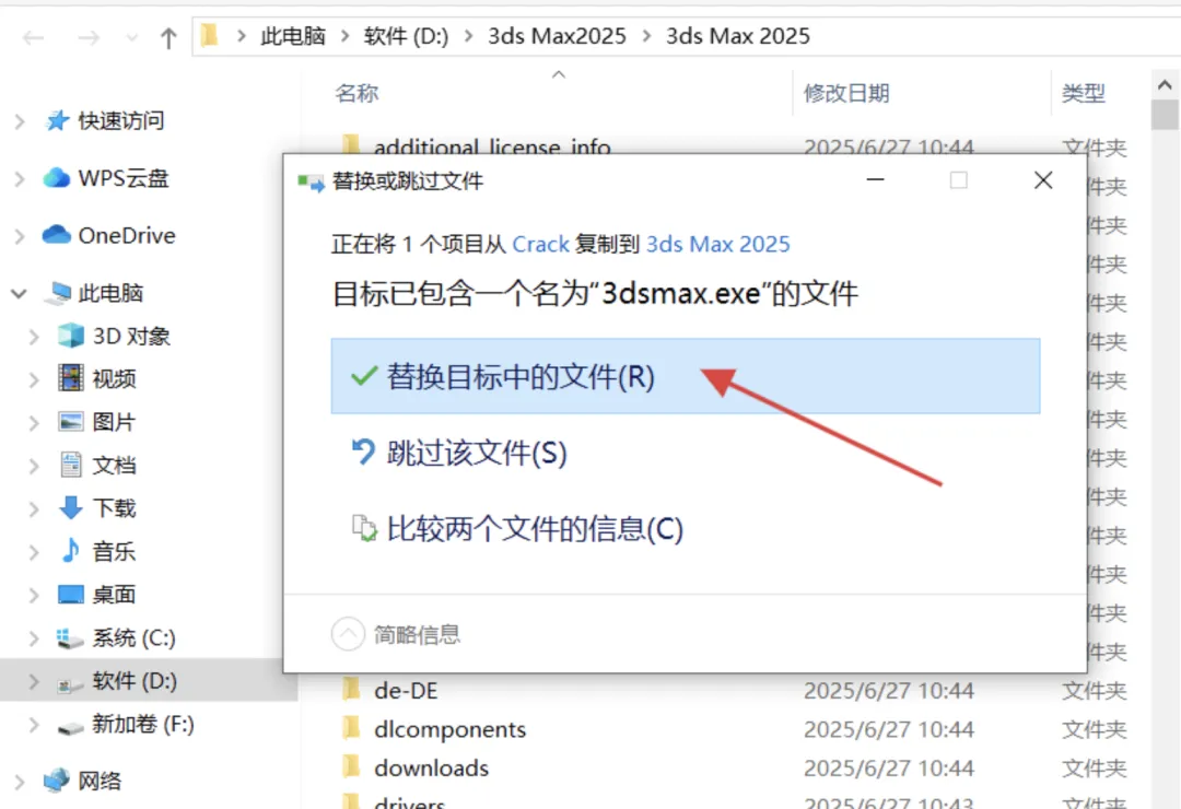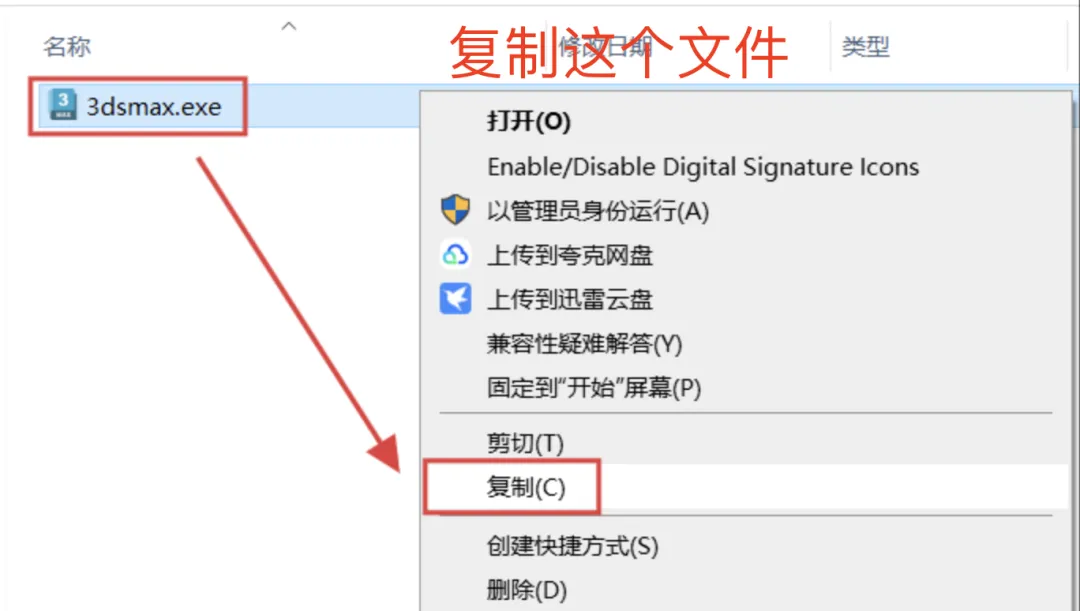 返回最初解压的文件夹,找到并打开文件夹:Crack。右键点击其中的文件:3dsmax.exe,选择:复制。