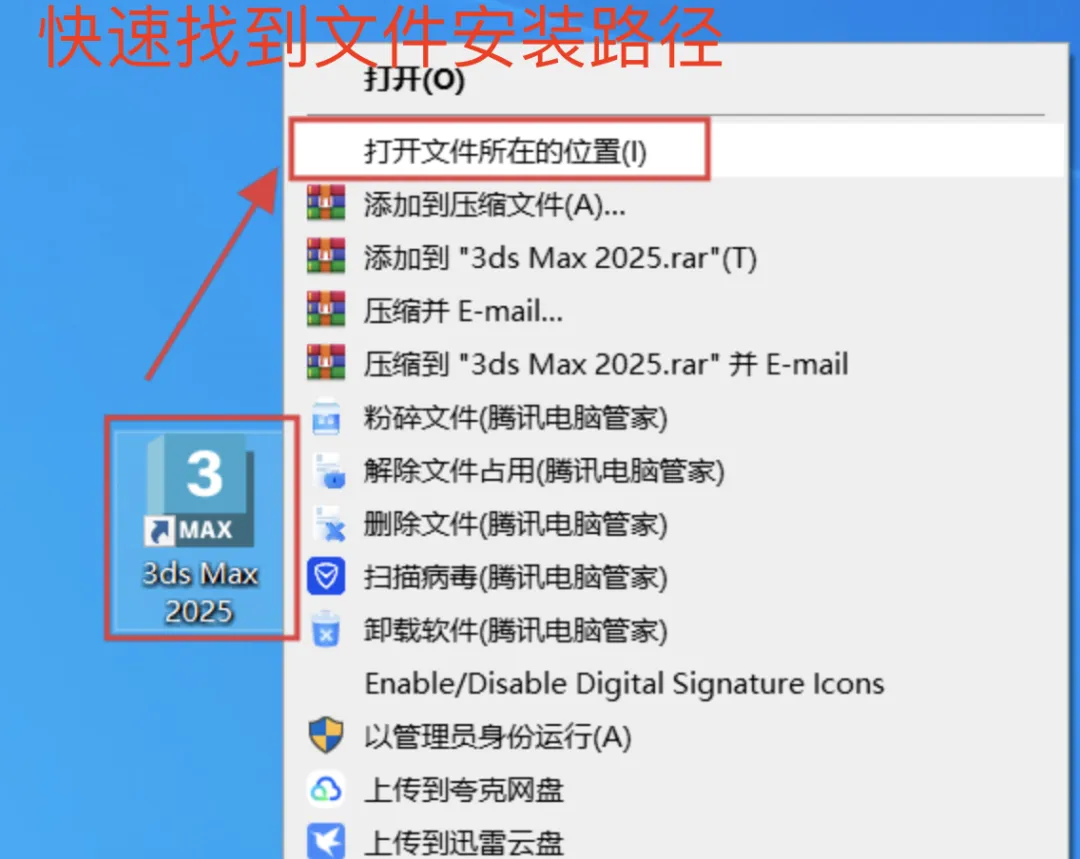 2、定位安装目录: 回到电脑桌面,找到刚刚生成的:3ds Max 2025,快捷图标,右键点击它,选择:打开文件所在的位置。