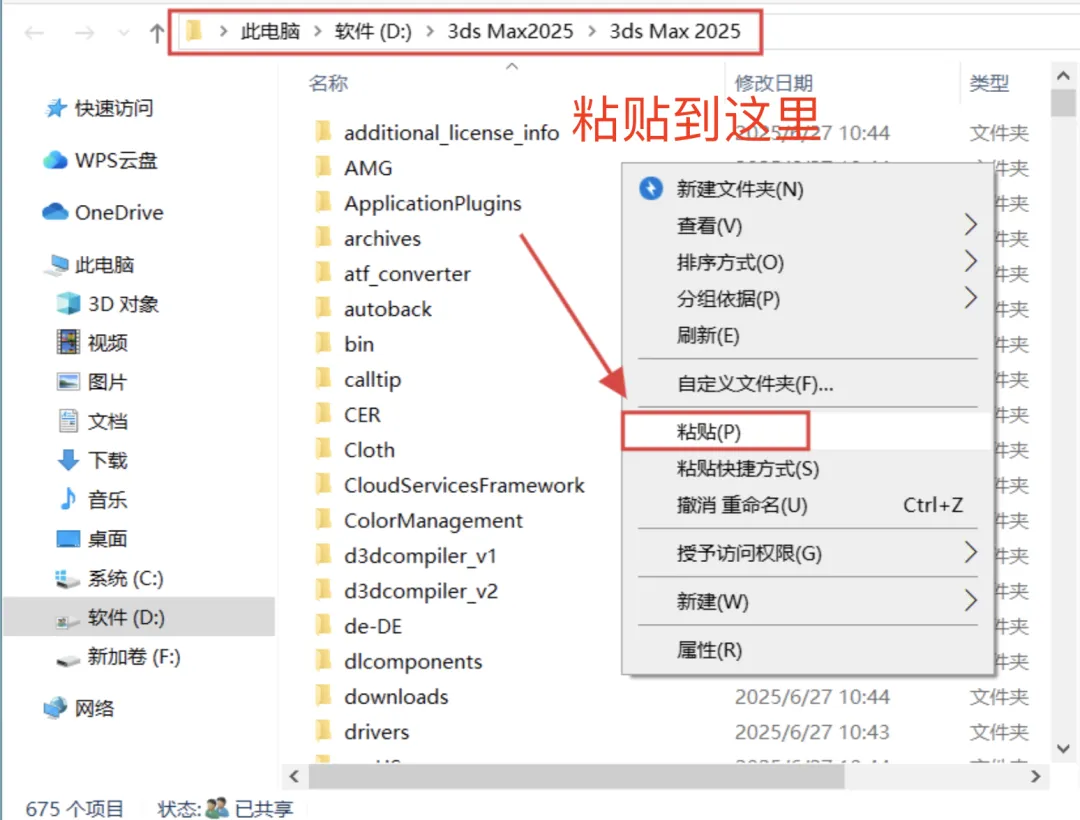 3、替换文件: 此时会打开3ds Max的实际安装目录。在文件夹的空白处右键点击,选择:粘贴。