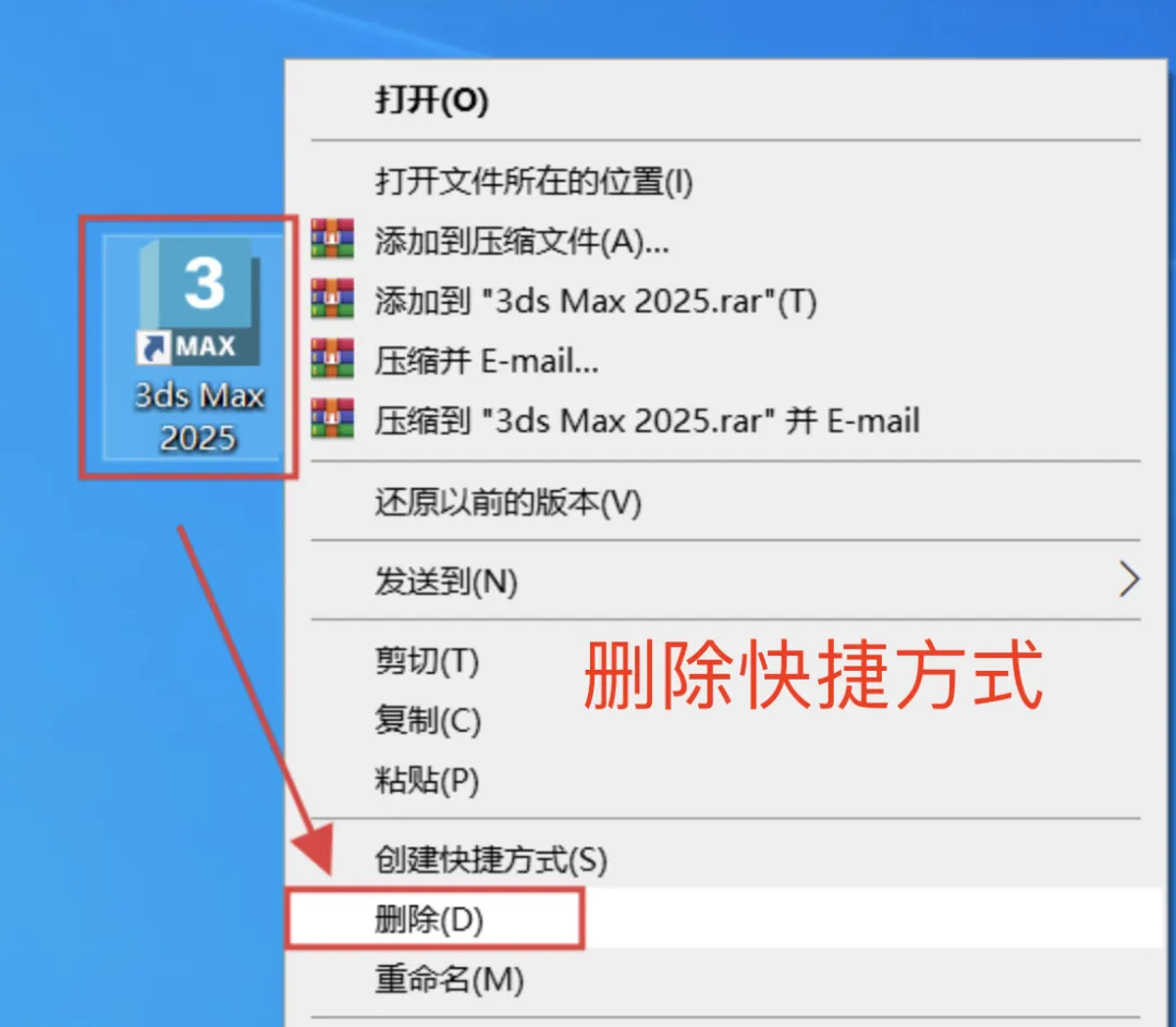 5、创建中文版快捷方式: 返回桌面,将旧的:3ds Max 2025 快捷方式删除。