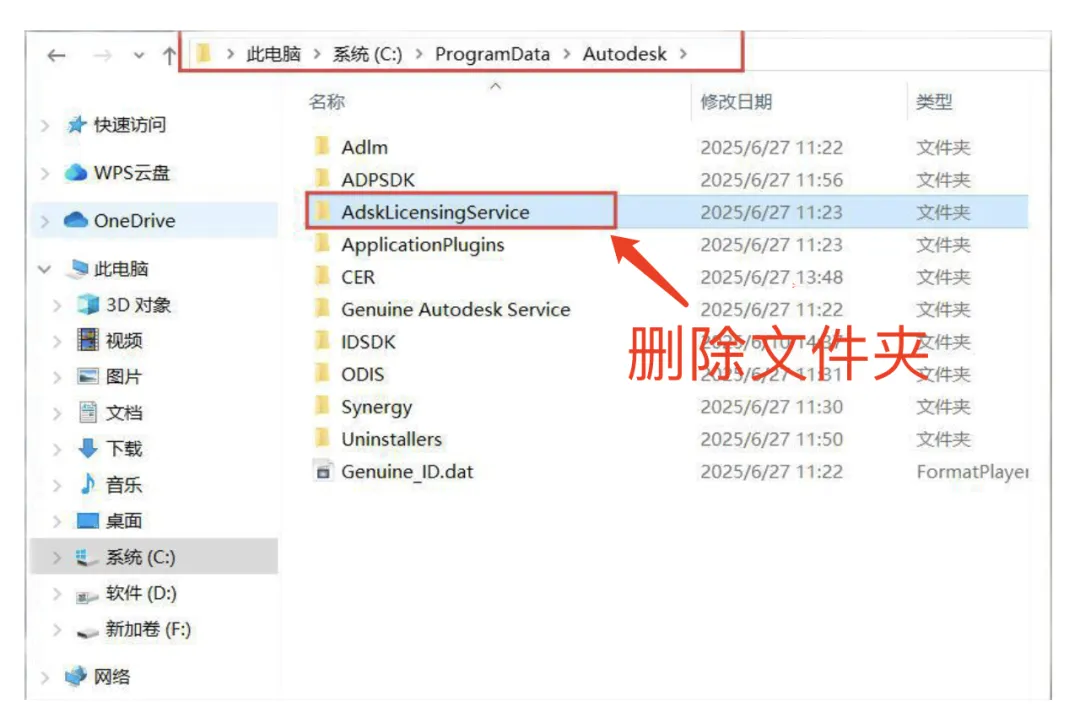 2、再打开路径 C:\ProgramData\Autodesk,删除其中的:AdskLicensingService文件夹。