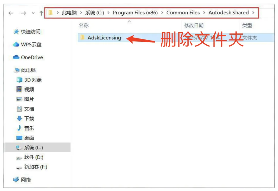 3、依次打开文件夹路径:C:\Program Files (x86)\Common Files\Autodesk Shared\,删除其中的:AdskLicensing 文件夹(如果存在)。