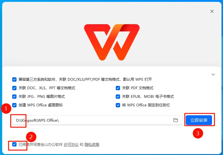 第五步:将安装位置改为D盘,然后勾选【已阅读并同意……】,然后点【立即安装】。