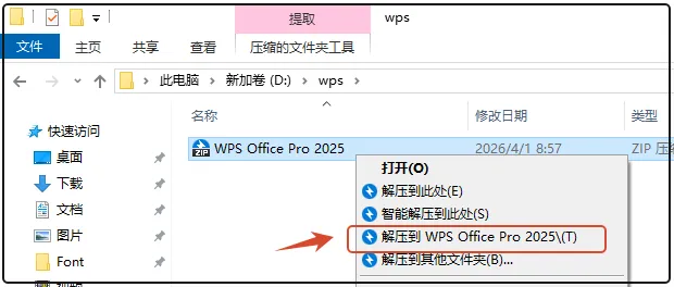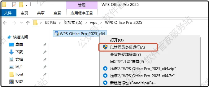 第三步:打开解压后的文件夹,选中【WPS Office Pro_2025_x64】安装程序,右击【以管理员身份运行】。