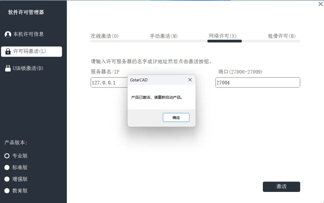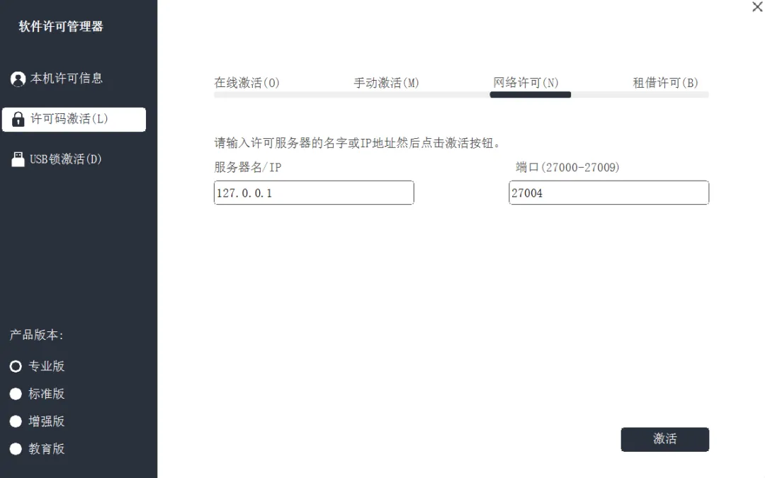 2.24,点击【许可码激活】->【网络许可】,服务器名输入【127.0.0.1】,端口输入【27004】然后点击【激活】。