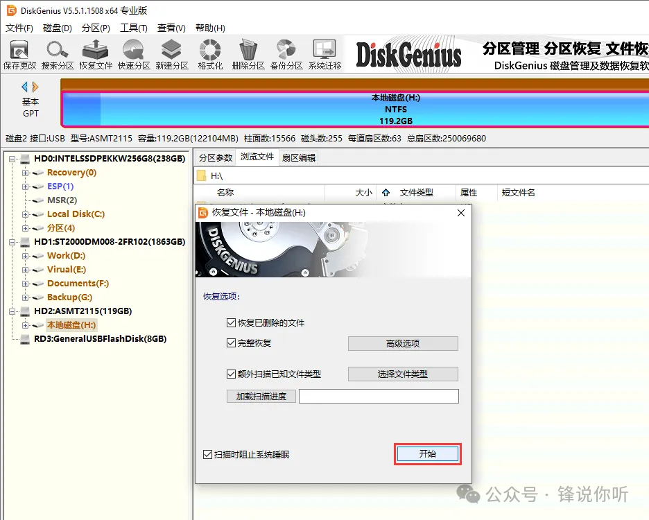 2. 点击“开始”按钮,软件将对所选分区进行扫描。